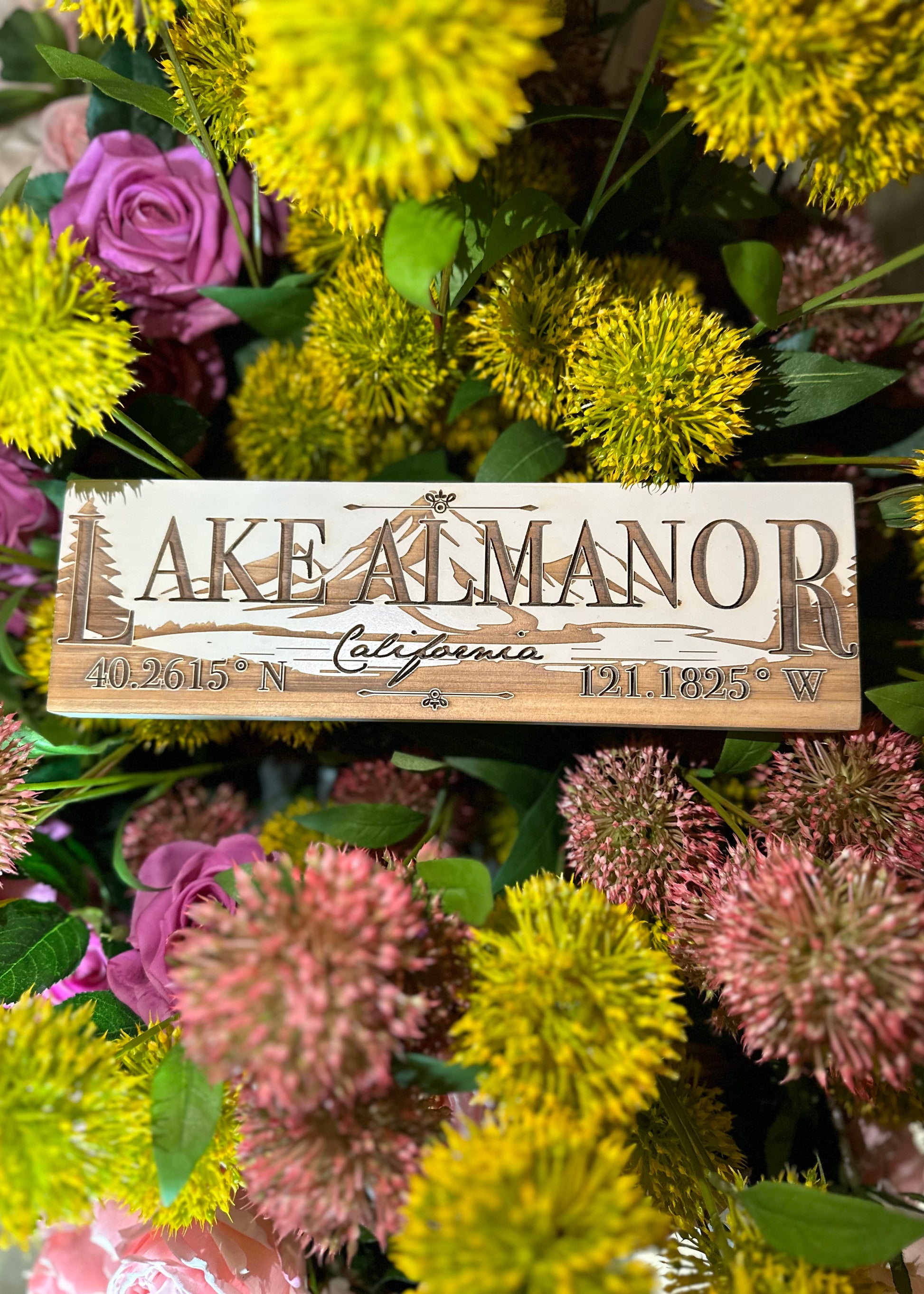 A Beautiful sign with mountains and a lake to give you a picture of Lake Almanor, including the coordinates.
