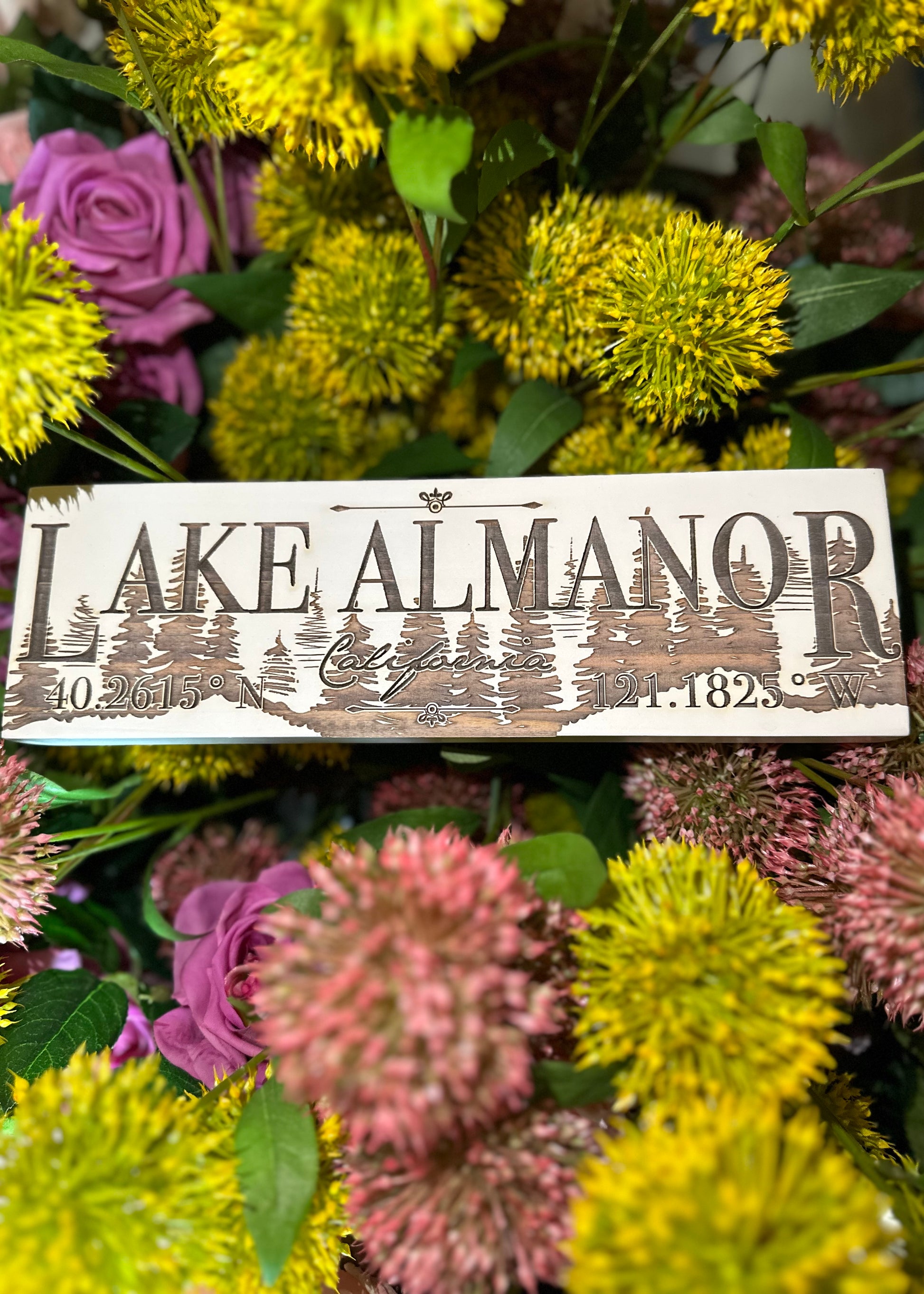 A beautiful sign with trees to give you a feel of Lake Almanor, including the coordinates.
