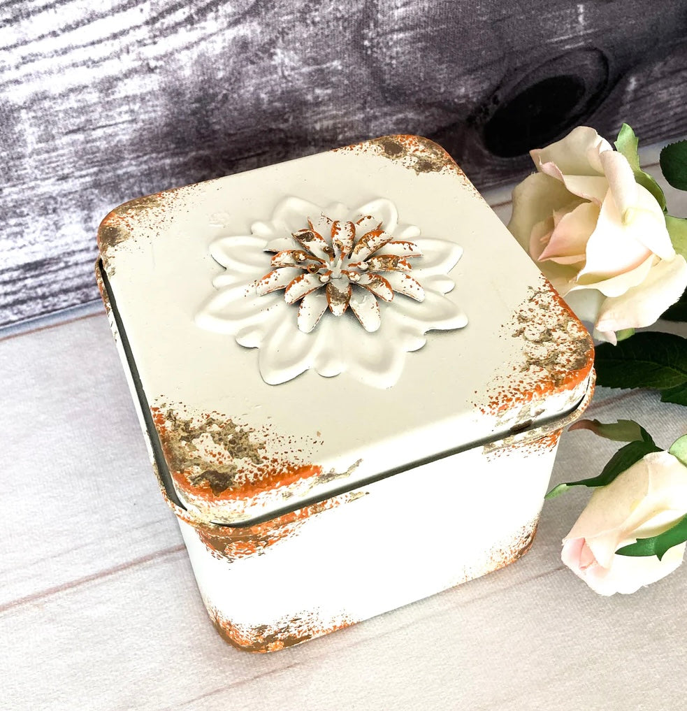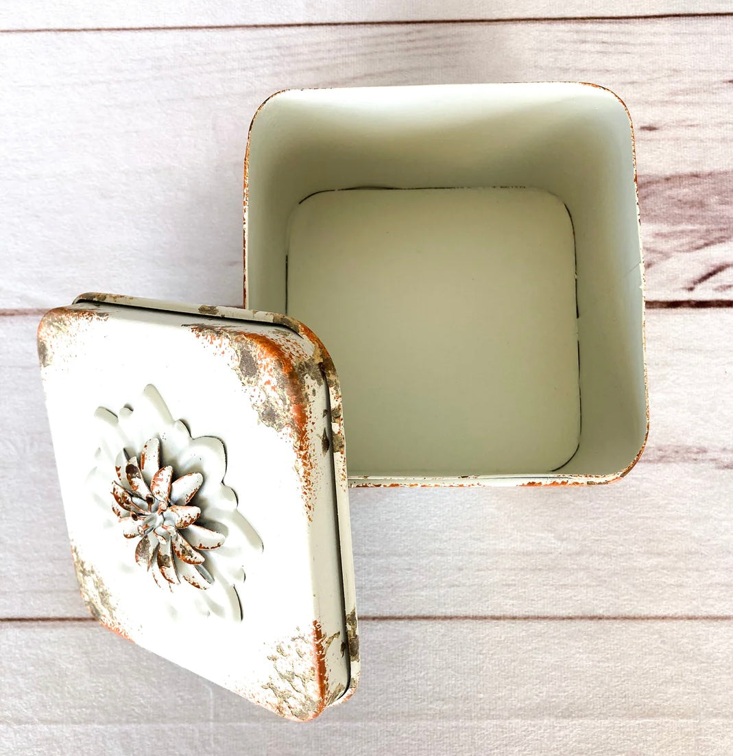 This gorgeous rustic container looks like something that would have been found on a covered wagon. Ideal for keeping small toiletry items, jewelry or anything really in. Features a decorative flower on the lid. Made of Metal.